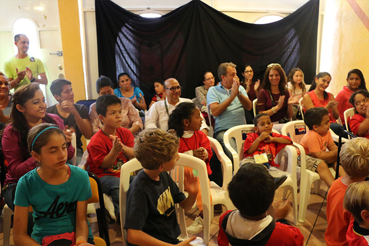Mariana y Diego, niños de talla baja, tratan de alcanzar el teléfono de una caseta en el centro...