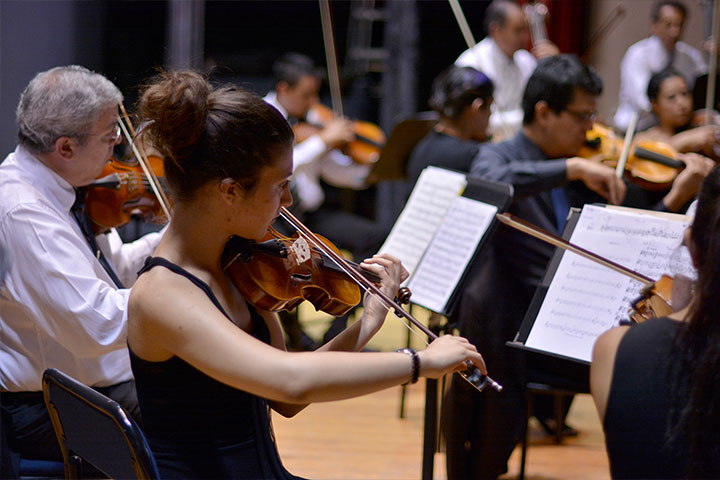 Con un lleno total en el auditorio del Centro Cultural Universitario, la Orquesta de Cámara de la...