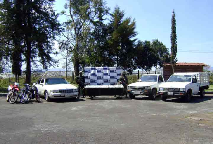 Varias dosis de mota, dos camionetas, un auto compacto y tres motonetas fueron aseguradas por pers...