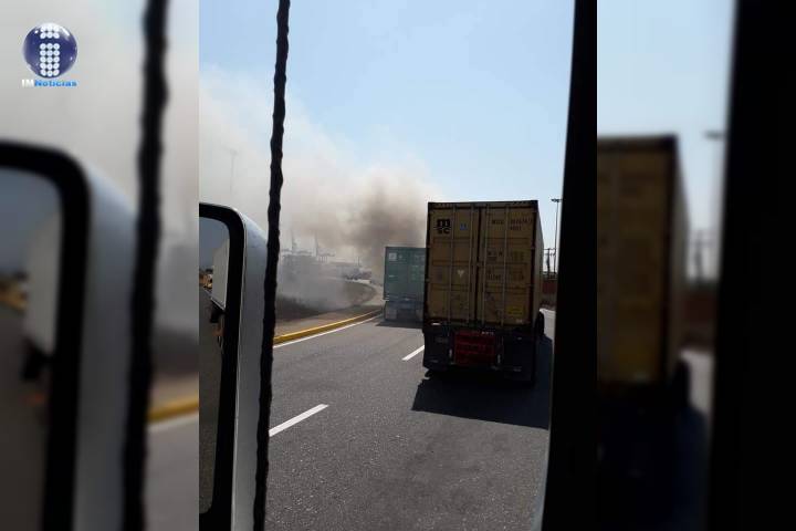 Un tráiler de la empresa TGLA se incendió en el interior del puerto de Lázaro Cárdenas, mientr...