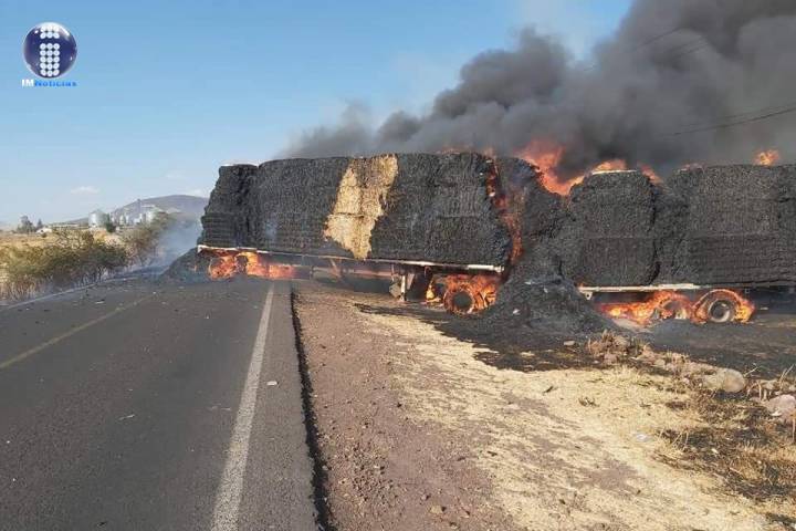 Un cargamento de pacas de paja que iban en dos semirremolques de un tractocamión se incendió y d...