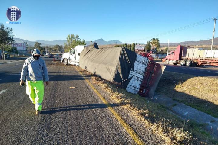 Un tractocamión quedó parcialmente volcado dentro de una cuneta ubicada en la carretera Morelia-...