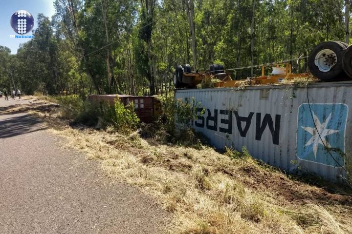 Un tráiler se salió de la superficie de rodamiento y terminó volcado en un desnivel ubicado a la ...