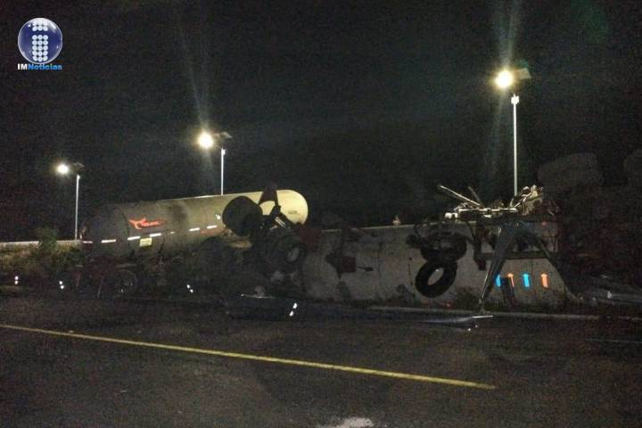 Una pipa de doble remolque, cargada con amoniaco, volcó sobre la autopista Pátzcuaro-Cuitzeo, en...