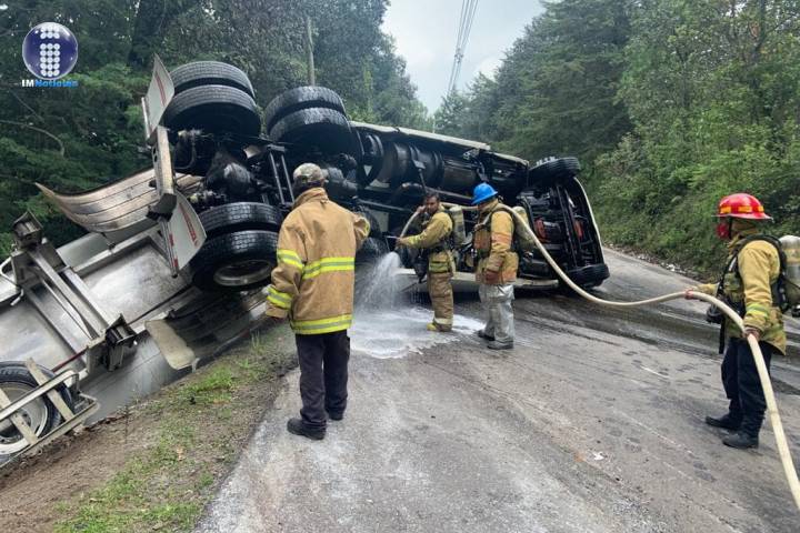 Un trailero quedó lesionado al momento de que un camión-pipa que manejaba volcó aparatosamente ...