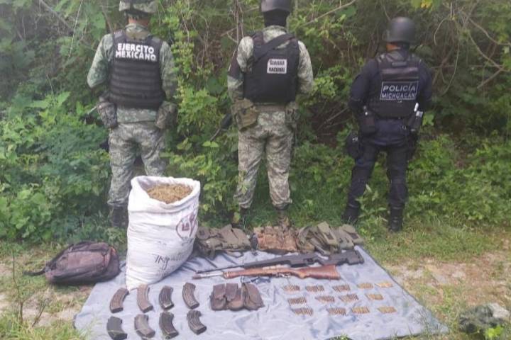 Aseguran SSP, Sedena y GN armas, 130 cartuchos y 8.5 kilos de marihuana