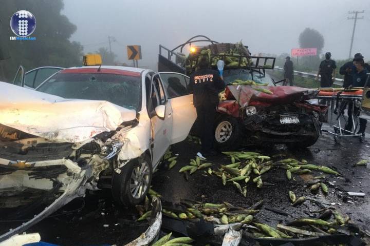 Un fuerte encontronazo de frente entre un taxi y una camioneta cargada con elotes dejo como saldo ...