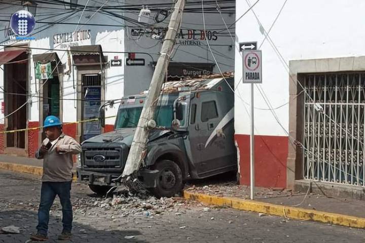 Un camión de valores que se salió de control en el Centro de Tacámbaro, derribó un poste de co...