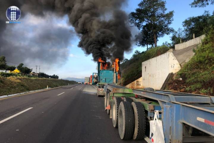 Un tráiler doblemente articulado se incendió por una falla mecánica en la carretera Morelia-Pá...