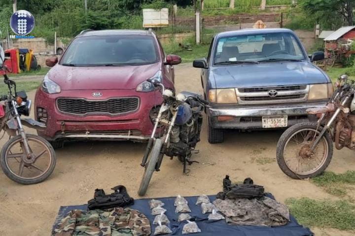 En Tiquicheo, SSP aseguró 5 vehículos, más de medio kilo de marihuana y equipo táctico