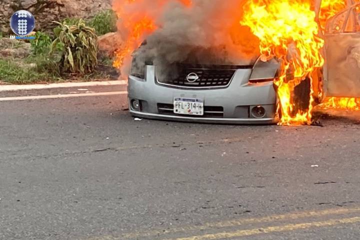 Un automóvil particular se incendió en la carretera Pátzcuaro-Uruapan debido a una falla mecán...