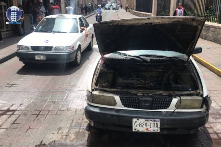 Arde motor de taxi en el centro de Morelia; conductor sufre leves heridas