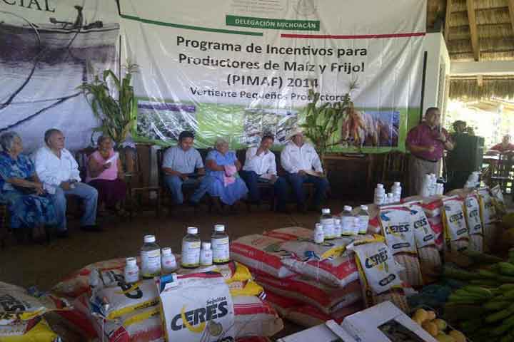 NOTICIAS 13/06/2014Sagarpa concluye con la entrega de Incentivos para Maíz y Fríjol Con la entrega de insumos a productores de la región en la localidad de La Ticla, perteneciente al municipio de Aquila, se concluyó el Programa de Incentivos para Maíz y Fríjol (PIMAF) 2014; Pedro Luis Benítez Vélez, delegado de Secretaría de Agricultura, Ganadería, Desarrollo Rural, Pesca y Alimentación (SAGARPA), en Michoacán sostuvo que con una inversión de 20 millones de pesos se pudo apoyar a campesinos de 28 municipios.