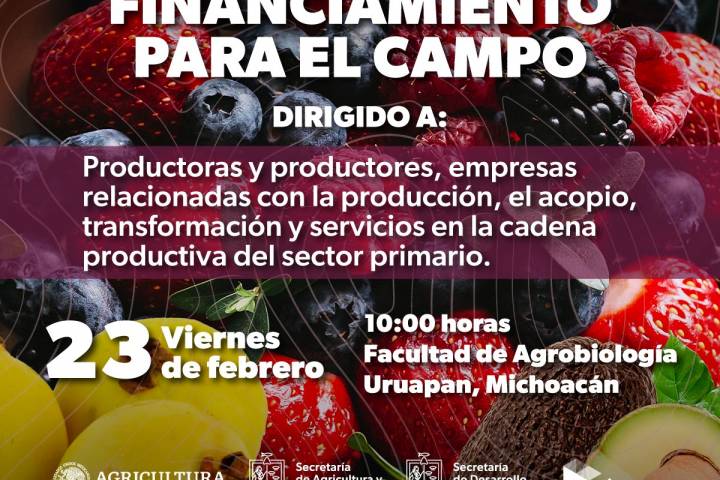 NOTICIAS 19/02/2024Acercarán opciones de financiamiento a productores del campo en Uruapan El viernes 23 de febrero se llevará a cabo en Uruapan la segunda Feria de Financiamiento para el Campo, dirigido a productoras y productores, asà como a empresas dedicadas a la producción, acopio, transformación y servicios en la cadena productiva del sector primario.