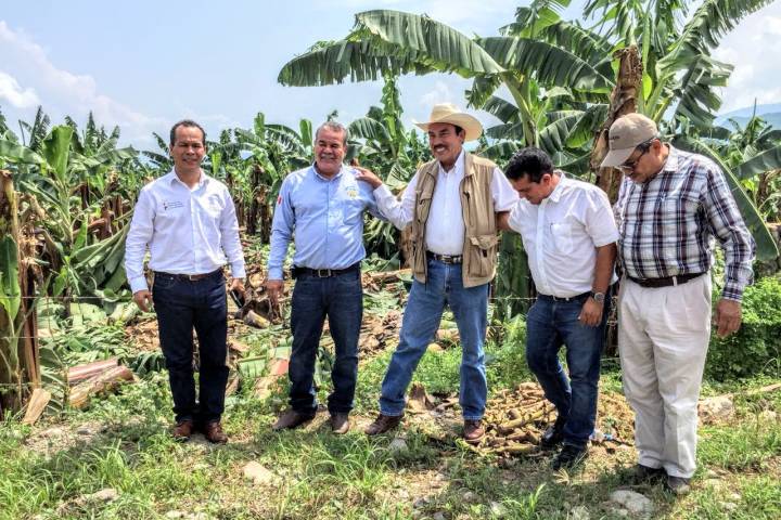NOTICIAS 07/08/2018Atiende Sedrua daños en cultivos de plátano por trombaRubén Medina Niño, titular de la Secretaría de Desarrollo Rural y Agroalimentario (Sedrua), acompañado del delegado de la Sagarpa en la entidad y productores, realizó un recorrido por huertos de plátano que fueron afectados por una tromba en el municipio de Coahuayana.