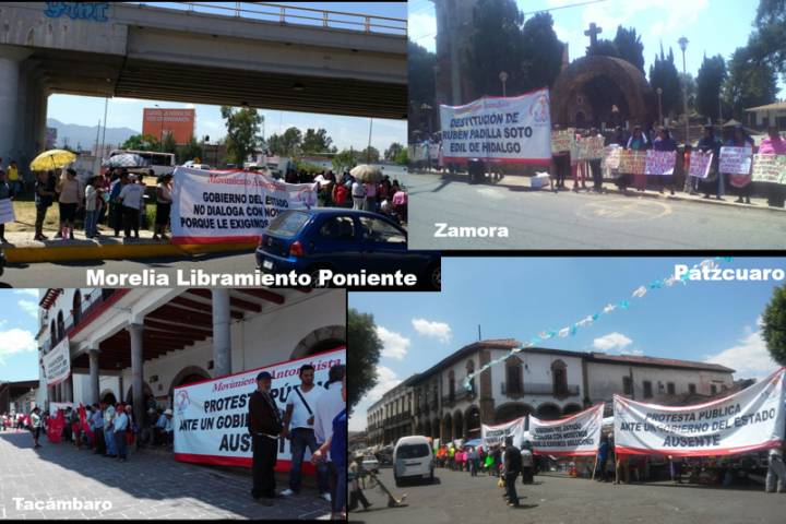 Con cadenas humanas simultáneas en al menos 11 ciudades del estado de Michoacán se llevó a cabo una protesta por parte de integrantes del Movimiento Antorchista, para denunciar que el Gobierno del estado está ausente de la solución de los problemas sociales y exigir al gobernador Silvano Aureoles Conejo dé pronta solución a las demandas planteadas por esta organización.