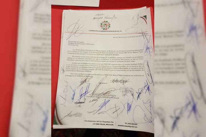 En un documento firmado por todos ellos y dirigido a Enrique Martinà Castillo, delegado de Gobernación en Michoacán, los 39 alcaldes en la entidad emanados de las filas del Partido Revolucionario Institucional (PRI) navegan en la idea de que los cargos del Gobierno Federal deben ser para su militancia y su beneficio.