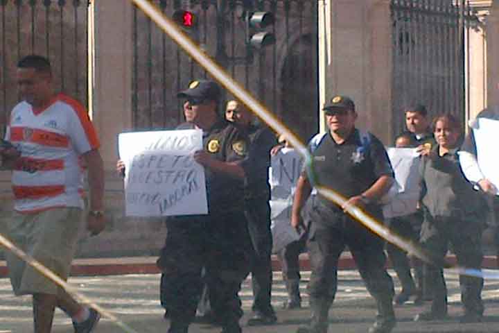 El retraso del pago de aguinaldo impulsó a varios elementos de la Policía Auxiliar a manifestar su descontento frente al Palacio de Gobierno para exigir el referido bono.