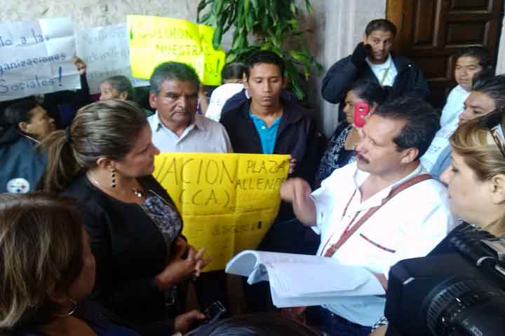 Los manifestantes pertenecientes a la Agrupación de Colonias, Ciudadanos y Organizaciones, se han plantado en el lugar para hacerse escuchar entre consignas escritas y gritos demandando a la par ser recibidos por el edil capitalino.