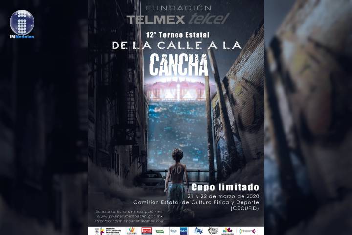NOTICIAS 02/03/2020Siguen abiertas inscripciones para Torneo de Fútbol de la Calle a la Cancha Continúan abiertas las inscripciones para participar en el 12 Torneo de Fútbol de la Calle a la Cancha, encuentro deportivo organizado por el Instituto de la Juventud Michoacana (Ijumich), en colaboración con Fundación Telmex-Telcel, con el objetivo de brindar a las y los jóvenes michoacanos la oportunidad de participar en torneos de fútbol a nivel nacional e internacional.