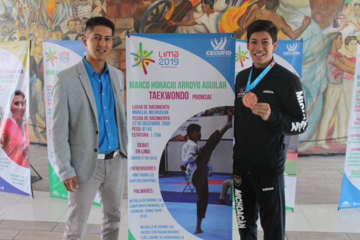 NOTICIAS 02/08/2019Marco Arroyo, orgullo de Michoacán, regresa de Lima 2019 con medalla de bronceDe regreso a Michoacán, después de ganar su primera medalla en Juegos Panamericanos, durante su participación en Lima 2019, el taekwondoín Marco Horacio Arroyo Aguilar, se reunió con Jorge Abdiel Díaz Acevedo, director general de la Comisión Estatal de Cultura Física y Deporte (Cecufid) con quien compartió la emoción de su presea.