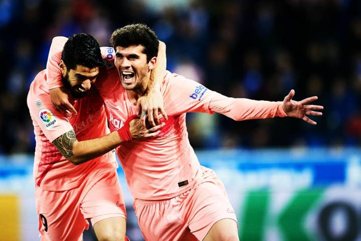 El FC Barcelona tiene muy cerca el título, y este martes ha dado un paso más para levantar la 26ª Liga. Y lo ha hecho dos días después de superar a la Real Sociedad, ganando a otro equipo vasco: el Alavés (0-2) en la 34ª jornada de Liga. Las dianas de Aleñá en el minuto 53 y de Suárez de penalti cuatro minutos después han tumbado al equipo entrenado por el exazulgrana Abelardo.