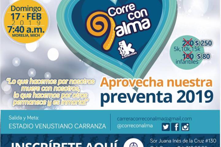 NOTICIAS 29/12/2018Preventa especial de la carrera Corre con AlmaLa carrera atlética Corre con Alma ya tiene fecha, se llevará a cabo el 17 de febrero del próximo año y como siempre, será en beneficio de la Asociación Mexicana de Ayuda a Niños con Cáncer (AMANC Michoacán). Para esta novena edición se realizará una Preventa Especial del 29 al 31 de diciembre, en donde los corredores gozarán de un descuento, un regalo perfecto de Día de Reyes.
