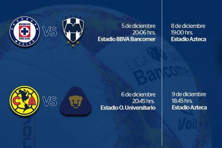 NOTICIAS 03/12/2018Así quedan los horarios Listos los días y horarios para la fase de Semifinales del torneo Apertura 2018 de la Liga MX, en la cual intervendrán los clubes Cruz Azul, América, Pumas y Monterrey. Los juegos de ida y vuelta se desahogarán entre el 5 y el 9 de diciembre.