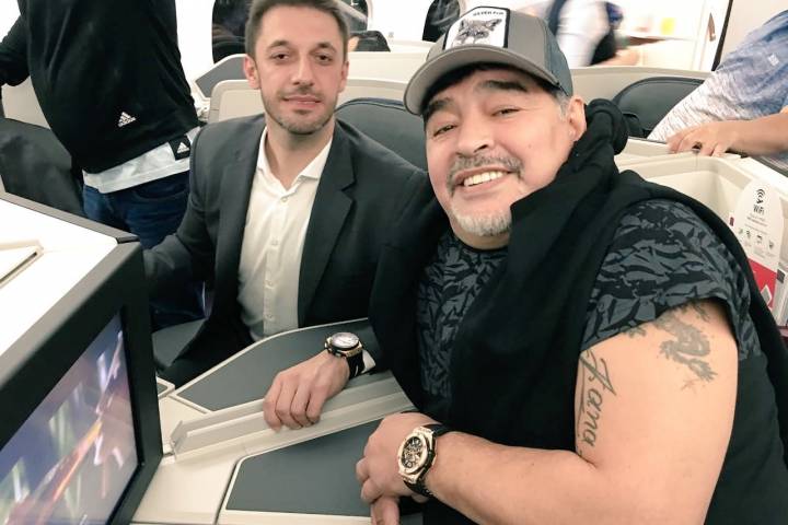 Escondido detrás de unos lentes de tonos rojizos, con una gorra y camiseta de color oscuro y sin afeitar, Maradona fue amable con los tripulantes de la nave que lo trajo desde Buenos Aires y saludó al p... Ver más...
