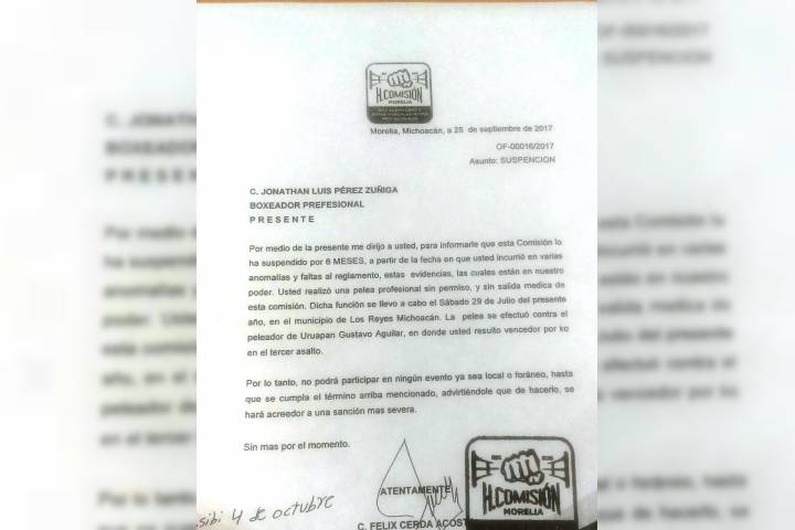 Por infringir el reglamento, el púgil moreliano, Jonathan Luis Pérez Zúñiga, fue sancionado seis meses por la Comisión de Box, Lucha Libre y Artes Marciales Mixtas Profesionales de la capital del estado.