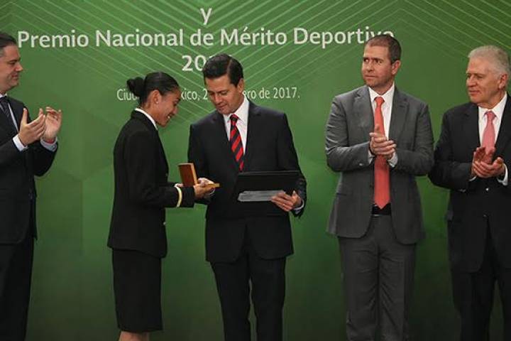Los medallistas olÃmpicos en RÃo de Janeiro 2016, el pentatleta Ismael Hernández, la taekwondoÃn MarÃa Rosario Espinoza, la marchista MarÃa Guadalupe González, el clavadista Germán Sánchez y el boxeador Misael RodrÃguez, encabezaron el grupo de 16 galardonados con el Premio Nacional del Deportes y Mérito Deportivo 2016, el cual fue entregado hoy por el presidente Enrique Peña Nieto.