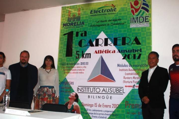 Con la intención de arrancar el año 2017 de la mejor manera en el rubro deportivo, el Instituto Municipal de Cultura Física y Deporte (IMDE), se une a la primera edición de la Carrera Atlética 5k., organizada por el instituto Ausubel Morelia, la cual tendrá verificativo el próximo domingo 15 de enero en punto de las 08:00 de la mañana, en el Centro Histórico de esta ciudad, con la participación de 600 corredores.