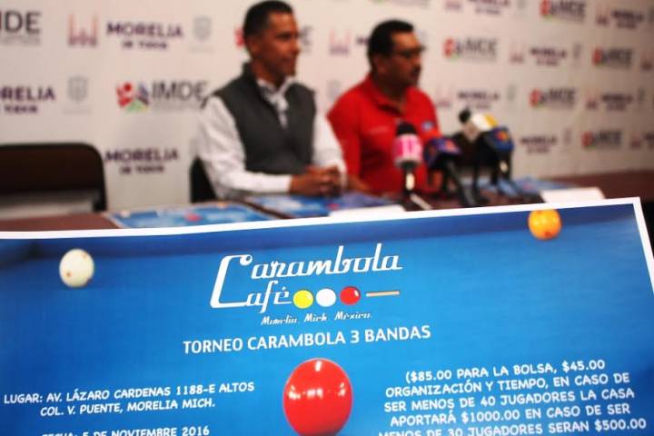 Regresa a Morelia el billar en su máxima expresión, luego de que el próximo sábado 5 de noviembre, se realice el Torneo Estatal de Carambola a 3 bandas, en el Café Carambola, el cual ´pretende reunir a poco más de 50 especialistas en la materia provenientes de diversos punto del estado. El director general del IMDE, Gustavo Juárez Bedolla, además del organizador del campeonato, José Alberto Paredes García, fueron las autoridades q...