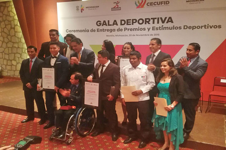 NOTICIAS 20/11/2015Entregan premios Estatal del Deporte y Mérito 2015En el marco del CV aniversario del inicio de la Revolución Mexicana, el gobernador del estado de Michoacán, Silvano Aureoles Conejo, hizo entrega de los premios Estatal del Deporte, al pelotari Eliot Rodríguez y al entrenador de squash Misael Castrejón; además del Premio al Mérito Deportivo 2015, a la sirena moreliana Beatriz Reséndiz García. En tanto que se adelantó el pago de tres meses en becas a un total de 140 actores del deporte. C... Ver más...