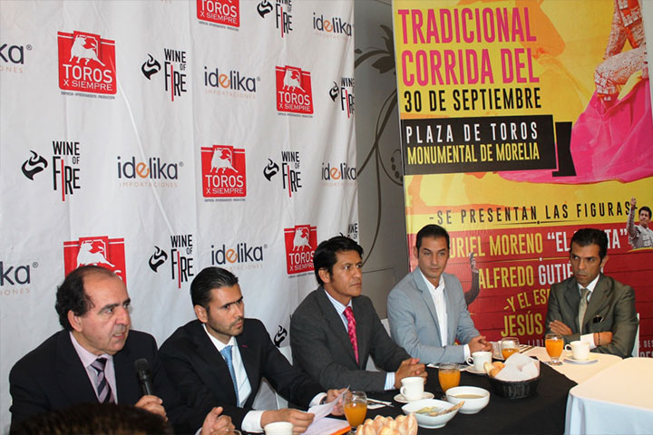 NOTICIAS 08/09/2015Presentan Corrida de Toros del 30 de septiembre en MoreliaEl diestro español Jesús Duque, encabeza el cartel de la tradicional Corrida de Toros del 30 de septiembre en la Plaza Monumental de Morelia, la cual también contará con la presencia de Uriel Moreno "El Zapata" y Alfredo Gutiérrez, quienes lidiarán 6 astados de la ganadería de Corlomé. Festejo que será organizado por la empresa Toros por Siempre.
