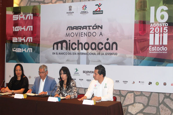 NOTICIAS 13/07/2015Presentan Maratón "Moviendo a Michoacán" En el marco del Día Internacional de la Juventud, el próximo domingo 16 de agosto, en la ciudad de Morelia, se llevará acabo el Maratón "Moviendo a Michoacán", con una bolsa en premiación cercana los 120 mil pesos, además de la rifa de un automóvil último modelo.