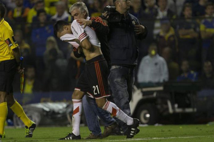 El partido de vuelta de los octavos de final de la Copa Libertadores en la Bombonera entre Boca Juniors y River Plate ha sido suspendido tras una hora y trece minutos de confusión por el ataque de fanáticos a jugadores del club visitante con una sustancia que la prensa local garantiza ser gas pimienta.