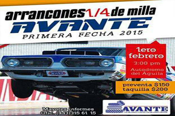 Una vez más el Autódromo del Águila, albergará toda la emoción y adrenalina del deporte motor cuando este domingo 1 de febrero reciba la actividad del Campeonato Metropolitano de motociclismo ¼ de milla, así como del Campeonato de Arrancones Avante 2015.
