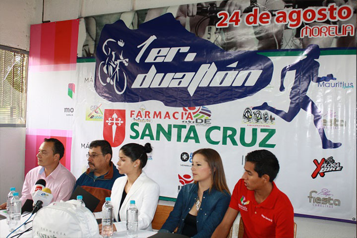 NOTICIAS 14/08/2014Presentan 1º Duatlón en MoreliaCon la intención de fortalecer el ámbito deportivo en la ciudad, el ayuntamiento de Morelia, en coordinación con Farmacia Santa Cruz, presentaron el Primer Duatlón, el cual tendrá verificativo el domingo 24 de agosto, a partir de las 07:45 horas, sobre la Avenida Camelinas.