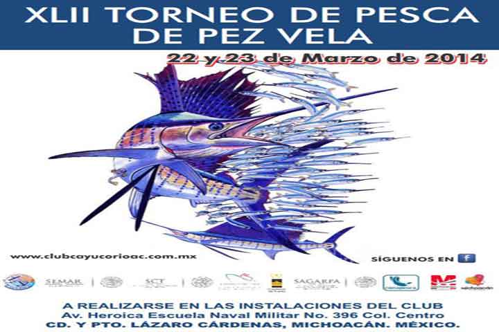NOTICIAS 19/03/2014Este fin de semana, el Torneo de Pesca de Pez VelaCon el prestigio de cuatro décadas ininterrumpidas, este 22 y 23 de marzo se llevará a cabo en Lázaro Cárdenas el Torneo de Pesca de Pez Vela que organiza el Club Cayuco Río, en el marco de la feria anual de la ciudad y puerto.