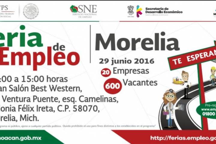 NOTICIAS 28/06/2016Ofertarán 600 vacantes en Feria de Empleo en Morelia Este miércoles se llevará a cabo la Feria de Empleo número 13 en el estado, siendo en esta ocasión la ciudad de Morelia en donde se ofertarán 600 vacantes por parte de 20 empresas de diversos giros que gracias a los trabajos de vinculación estarán presentes en el Gran Salón del Hotel Best Western, donde de manera directa entrevistarán a los buscadores de empleo, informó el titular de la Secretaría de Desarrollo Económico (Sedeco), Ant... Ver más...