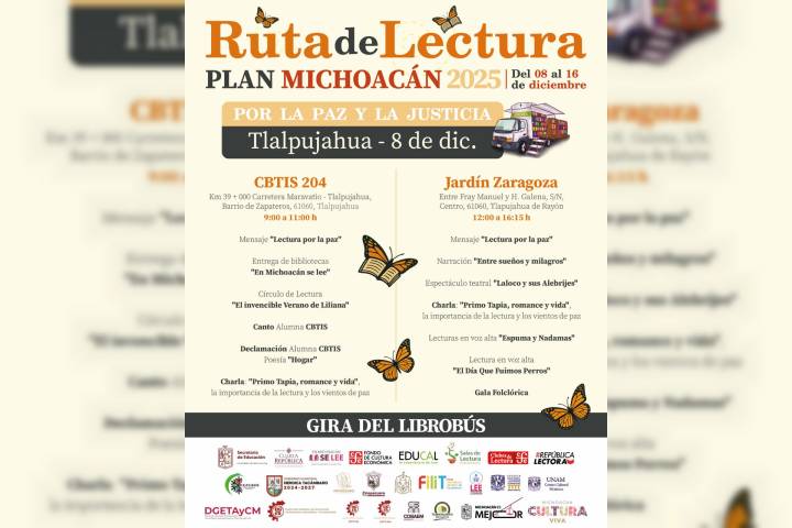 NOTICIAS 05/12/2025Ruta de Lectura Plan Michoacán llegará a TlalpujahuaLas secretarías de Cultura y Educación de Michoacán, en coordinación con el Gobierno de México, llevarán a cabo una jornada de fomento a la lectura en Tlalpujahua, como parte de la Ruta de Lectura Plan Michoacán 2025, estrategia que se desarrollará del 8 al 16 de diciembre en distintos municipios del estado.