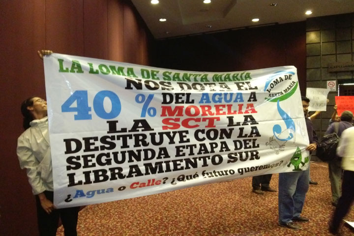 En el marco de la inauguración del Tercer Foro Regional El Agua, un Derecho Humano y Fundamental en México, integrantes del movimiento ciudadano en defensa de La Loma se manifestaron de manera pacífica para exigir que se respete esta zona y que se detenga la construcción de la vialidad que pone en peligro la zona de abastecimiento de agua para la ciudad de Morelia.
