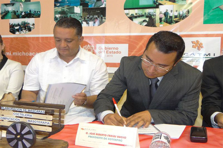 José BertÃn Cornejo MartÃnez, director general del Instituto de Capacitación para el Trabajo en el estado de Michoacán (ICATMI), firmó un convenio de colaboración con la Asociación de Hoteleros de Pátzcuaro (HOTERPAC), representado por José Alberto FarÃas Bucio, y entregó 300 constancias a igual número de egresados del plantel Icatur-Tzurumútaro.