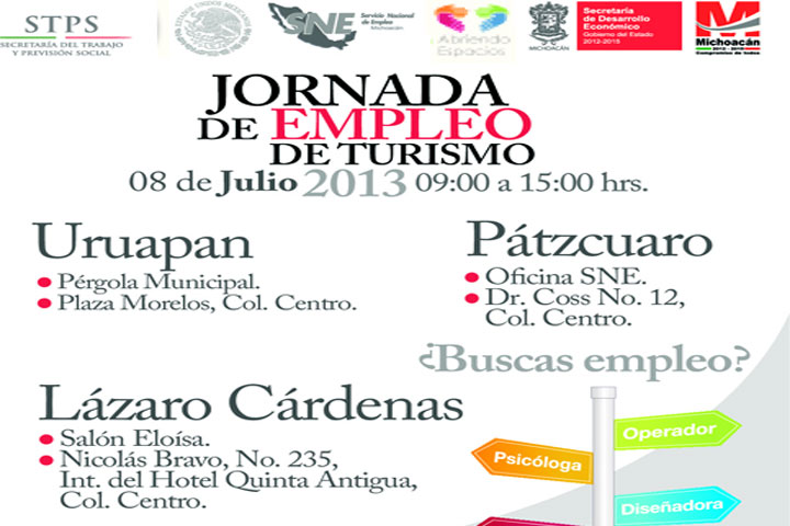 El próximo lunes 8 de julio el Servicio Nacional del Empleo en Michoacán, llevará a cabo la Jornada de Empleo de Turismo 2013 en los municipios de Uruapan, Pátzcuaro y Lázaro Cárdenas simultáneamente, donde 160 empresas del rubro estarán ofertando más mil 300 vacantes, así lo informó el titular de la dependencia Rodolfo Camacho Ceballos.