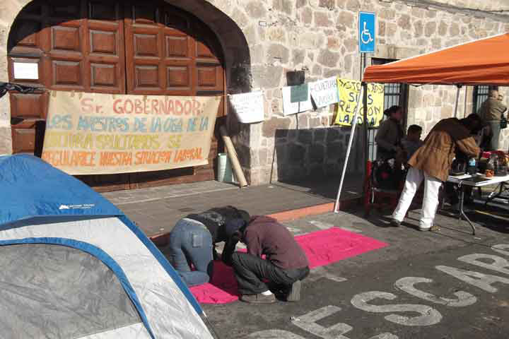En pancartas los inconformes exigen al Gobernador se atienda la demanda de docentes que tienen trabajando en la institución desde tres hasta más de diez años.