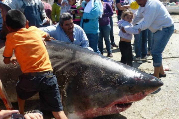 El tiburón blanco tiene unos 6 metros de largo y cerca de mil kilos de peso. Según pescadores, es el más grande que hayan visto, pues en marzo pasado unos compañeros sacaron un tiburón blanco, pero más chico: 4 metros de largo y aproximadamente 4... Ver más...