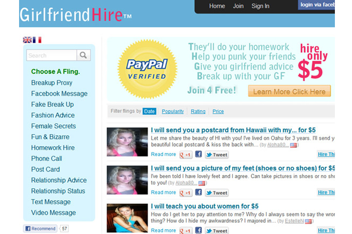 NOTICIAS 02/05/2012A llegado la oportunidad para los solteros, por 5 dólares al mes pueden tener una cibernoviaEn la página "Girlfriend Hire", las chicas se ofrecen a dejar mensajes amorosos vÃa Facebook, Twitter o cualquier otra plataforma de Internet. Su creador señala que el lugar está lejos de ser un sitio de sexo pago.