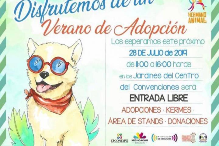 NOTICIAS 25/07/2019Este domingo Festival de Adopción de Verano Porque el verano y las vacaciones son una buena época para hacer nuevos amigos este domingo 28 de julio realizaremos el festival Verano de Adopción en los jardines del Centro de Convenciones de Morelia (CECONEXPO) de las 11 a las 16 horas.