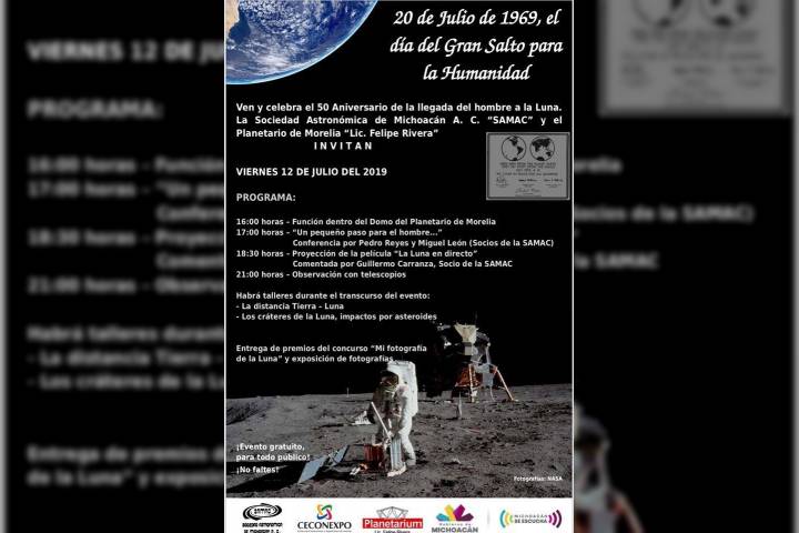 NOTICIAS 11/07/2019Celebrará Planetario de Morelia 50 Aniversario de la llegada del hombre a la luna El Planetario del Centro de Convenciones de Morelia en coordinación con la Sociedad Astronómica de Michoacán A.C., celebrarán el 50 Aniversario de la llegada del hombre a la Luna con distintas actividades, entre conferencias, talleres y una función especial gratuita a las 16 horas, este viernes 12 de julio del año en curso.